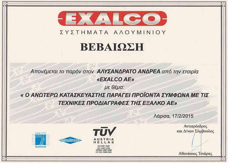 Η επιχείρηση Ανδρέα Αλυσανδράτου δραστηριοποιείται πάνω από 10 χρόνια στον κλάδο του αλουμινίου και εδρεύει στην Κεφαλονιά στα Μακρυώτικα Πυλάρου. Κατά κύριο λόγο ασχολείται με επεξεργασία και τοποθέτηση κουφωμάτων αλουμινίου τα οποία προμηθεύεται από τους μεγαλύτερες και πιο αξιόπιστους κατασκευαστές όπως η EXALCO και η ALOUSYSTEM. Η πολυετή μας πείρα, μας έχει κάνει ειδικούς στην τοποθέτηση και επεξεργασία του κουφώματος αφού έχουν εμπιστευτεί όλα αυτά τα χρόνια μαζί μας πολύ μεγάλες εταιρίες και ιδιώτες και θα μπορούσαν σήμερα να μιλήσουν και ίδιοι για τον επαγγελματισμό το άριστο αποτέλεσμα των εργασιών μας. Επίσης ασχολούμαστε με κατασκευές σιδήρου παντός τύπου.