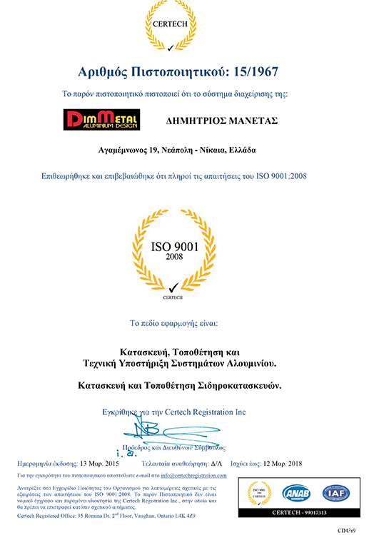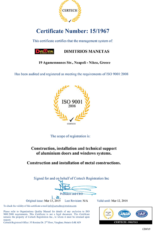 Η εταιρεία εφαρμόζει το σύστημα διαχείρισης ποιότητας κατά ISO 9001:2008 για Κατασκευή, Τοποθέτηση και Τεχνική Υποστήριξη Συστημάτων Αλουμινίου καθώς και για Κατασκευή και Τοποθέτηση Σιδηροκατασκευών. Τα παραγόμενα προϊόντα πληρούν όλες τις προδιαγραφές για να φέρουν τη σήμανση CE καθώς η εταιρεία λειτουργεί βάση των Ευρωπαϊκών προδιαγραφών.